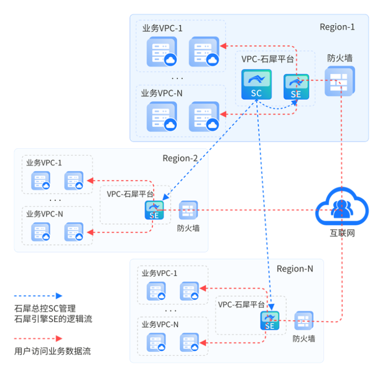 基于此,石犀科技以“集中管控+分布式防护”为核心理念,为其量身打造了一套适配多云环境的安全运营方案。该方案采用“总控平台(SC)+区域引擎(SE)”的部署模式,在多个地域节点部署轻量引擎,并依托单一石犀总控平台完成集中配置与运维管理,真正实现多云环境下的安全“一盘棋”。