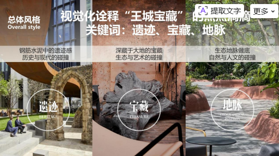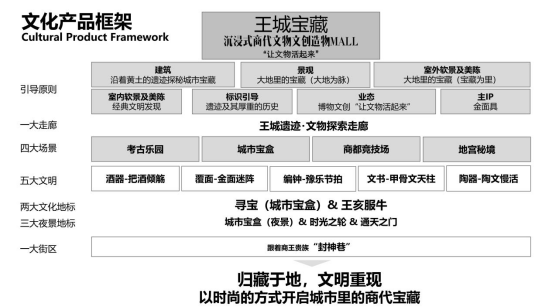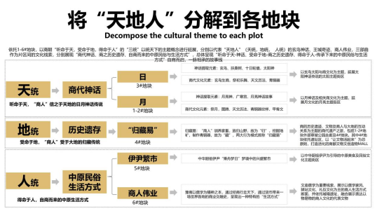 郑州商代王城遗址项目通过三步走策略实现文化与商业深度融合,先是依托文化分析六度模型提取商文化元素,遴选神话元素,结合商业运用与地块历史属性,确立“商×神话×历史”的“商的创世史诗”核心文化主题;再将“天地人”理念拆解落地至各地块,以“天/日月神话”“地/王城奇迹”“人/ 商人伟业”对应不同空间主题;最后通过与各专业对话,完成从“历史文献”到“商业表达”的翻译转化,将文化素材精准融入空间方案。最终项目成功落地,成为兼具文化底蕴与商业活力的现象级作品,为遗址活化利用提供了典范。